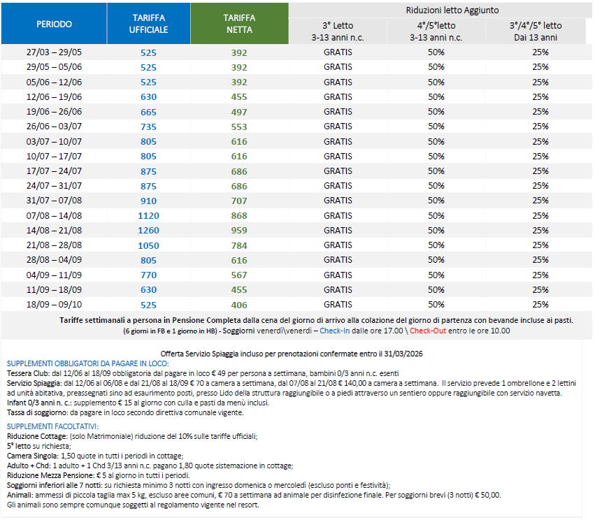 ervizio Spiaggia: dal 14/06 al 09/08 e dal 23/08 al 13/09 € 70 a camera a settimana, dal 09/08 al 23/08 € 140,00 a camera a settimana. Il servizio prevede 1 ombrellone e 2 lettini ad unità abitativa, preassegnati sino ad esaurimento posti, presso Lido della struttura raggiungibile o a piedi attraverso un sentiero oppure presso lido convenzionato, raggiungibile con servizio navetta.