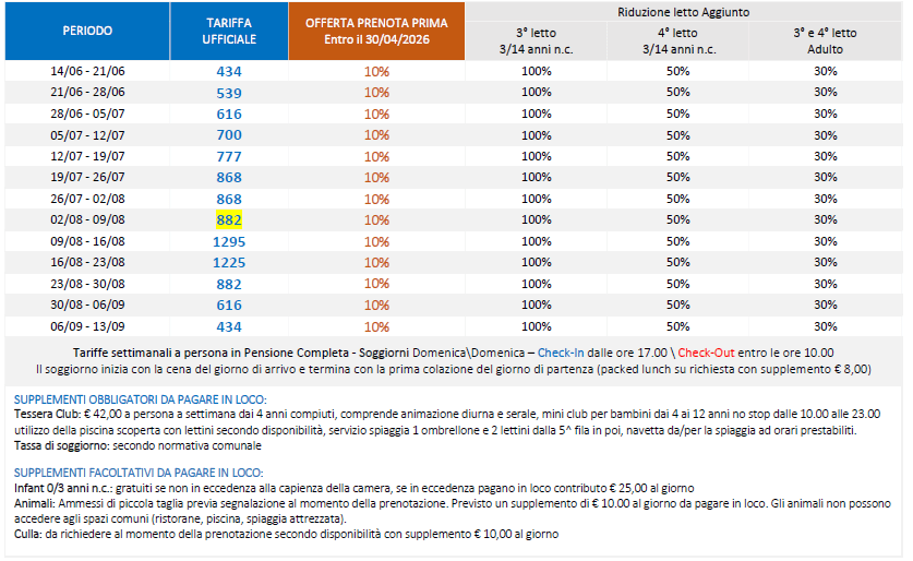 SERVIZI: La struttura, pensata per il benessere di famiglie, coppie o comitive in cerca di divertimento dispone dei seguenti servizi: Reception h24, ascensore, ristorante, bar in piscina, parcheggio interno non custodito gratuito, garage ( con supplemento giornaliero di € 5,00 al giorno), piscina di forma circolare con zona riservata ai bambini, animazione diurna e serale, baby club, miniclub, junior club, tennis, calcetto, pallavolo, area video giochi e parco giochi per bambini, terrazzo solarium attrezzato, sala tv, connessione wi-fi nella hall ed in piscina.