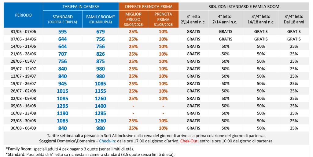 Tessera Club: (escluso i periodi dal 31/05 al 13/06) € 125,00 a camera doppia a settimana; € 130,00 a camera tripla a settimana; € 160,00 a camera quadruple e quintuple a settimana;