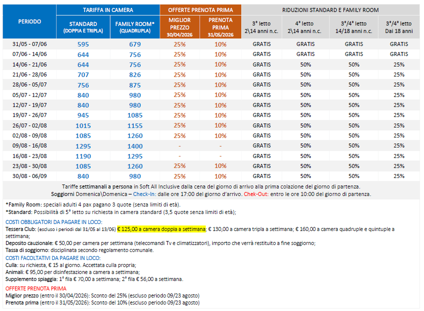 Tessera Club: animazione diurna e serale; servizio spiaggia dalla 3° fila in poi, 1 ombrellone + 1 lettino + 1 sdraio per camera; tennis, uso piscine (dalle 9.00 alle 13.00 e dalle 15.00 alle 19.00), sdraio ad esaurimento, e campi sportivi, animazione e miniclub (4/12 anni) in apposita area verde, junior club (12/16 anni), serate di animazione con spettacoli, cabaret, musical, giochi e feste organizzate, parcheggio privato. A pagamento: uso individuale del campo polivalente (uso notturno non disponibile), servizio medico, servizio lavanderia, escursioni. Animali ammessi di piccola taglia su richiesta.