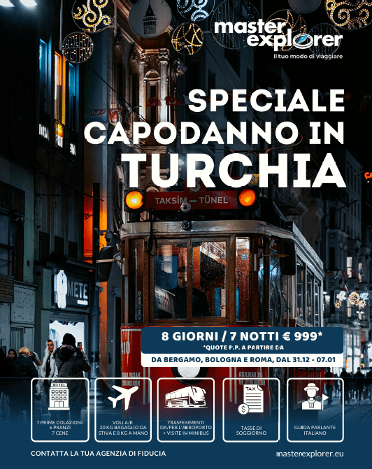 - 6° giorno – Istanbul: Prima colazione in albergo. Attraversamento del Corno d’Oro, l’antico porto bizantino e ottomano. Visita agli antichi quartieri di epoca bizantina di Balat e di Fener, scenari naturali di numerose fiction di successo dove si erge maestoso il Patriarcato Ecumenico di Costantinopoli equivalente a San Pietro a Roma; alla Moschea di Rustempasa, costruita nel 1560 da Sinan per Rustem Pasa, e al Mercato delle Spezie, conosciuto anche con il nome di Mercato Egiziano, che si sviluppa come prolungamento del Gran Bazaar con le bancarelle che propongono spezie di ogni tipo, caffè, dolci e frutta. Pranzo in ristorante presso il Ponte di Galata dove si potrà piacevolmente contemplare il via vai dei traghetti, mentre i pescatori vendono ai ristoranti quanto hanno pescato. Possibilità di partecipare a una gita (facoltativa, a pagamento) sul Bosforo, per ammirare il versante asiatico ed europeo della città. Proseguimento per la piazza principale della città: Taksim da dove inizia Via Istiklal, la strada più popolare della città piena di tutti i tipi di negozi, ristoranti, caffè e spettacoli di strada. Passeggiata nel quartiere di Pera per fotografare la Torre di Galata, il Mercato di Pesce e il Passaggio di Fiori. Rientro in albergo. Cena in albergo e pernottamento. Possibilità di partecipare al Cenone di Capodanno (facoltativa, a pagamento).